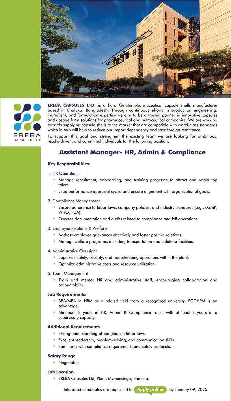 EREBA CAPSULES LTD. is a hard Gelatin pharmaceutical capsule shells manufacturer based in Bhaluka, Bangladesh. Through continuous efforts in production engineering, ingredient, and formulation expertise we aim to be a trusted partner in innovative capsules and dosage form solutions for pharmaceutical and nutraceutical companies. We are working towards supplying capsule shells to the market that are compatible with world-class standards which in turn will help to reduce our Import dependency and save foreign remittance. To support this goal and strengthen the existing team we are looking for ambitious, results-driven, and committed individuals for the following position.