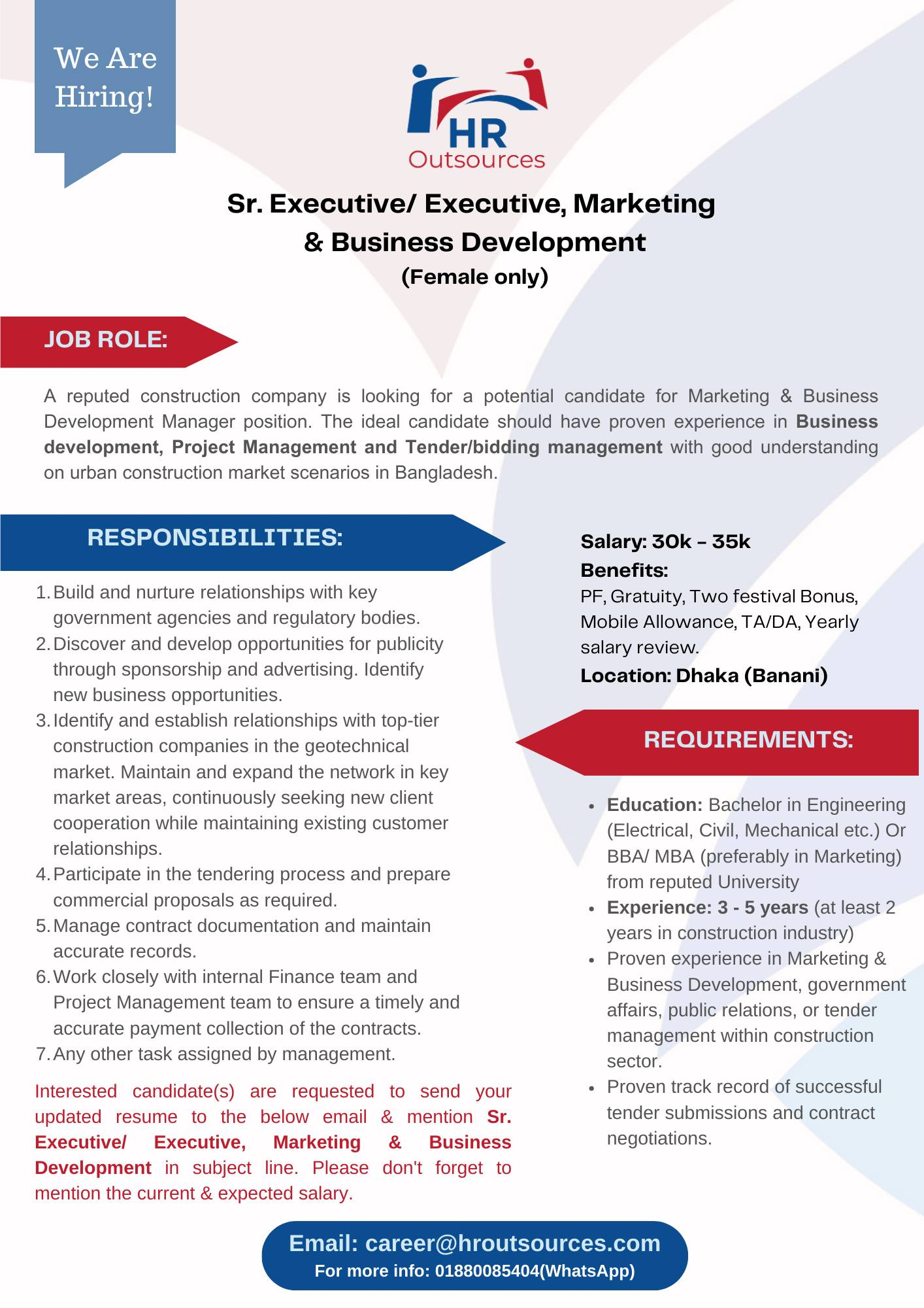 A reputed construction company is looking for a potential candidate for Sr. Executive/ Executive, Marketing & Business Development position. The ideal candidate should have proven experience in Business development, Project Management and Tender/bidding management with good understanding on urban construction market scenarios in Bangladesh.